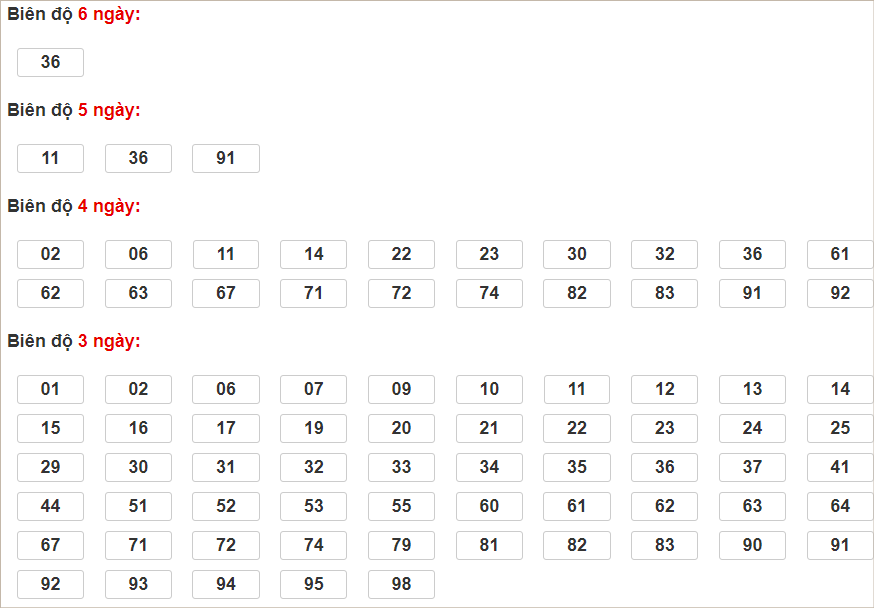 Cặp lô 02, 06, 21, 22, 24, 25, 26, 28, 31, 32, 33, 34, 37, 38, 42, 52, 60, 62, 63, 64, 65, 67, 71, 73, 74, 76, 78, 79, 83, 92, 93 có độ dài 2 ngày.