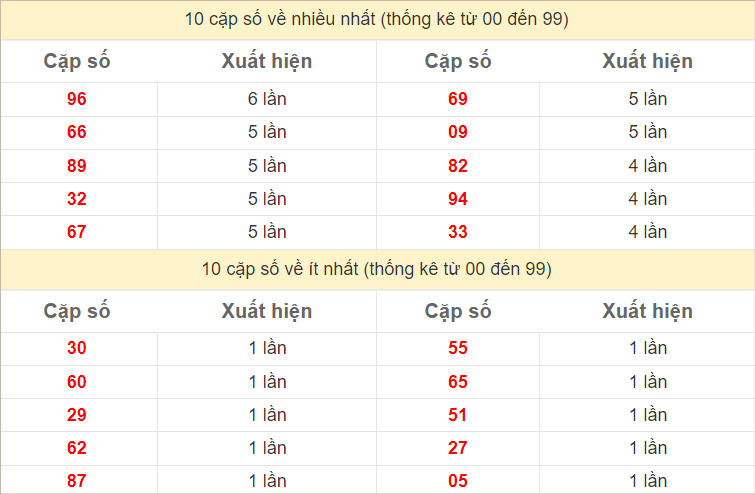 ⭐️ Thống kê tần suất các cặp lô về nhiều trong 10 ngày gần đây: 52 (7 lần), 21, 22, 33, 76, 96 (6 lần), 01, 07 (5 lần)