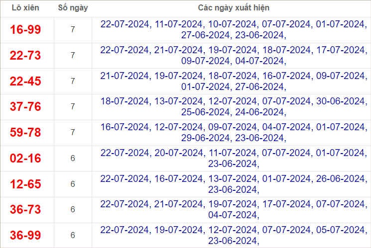 THỐNG KÊ LÔ TÔ KẾT QUẢ XSMB NGÀY 22-7-2024