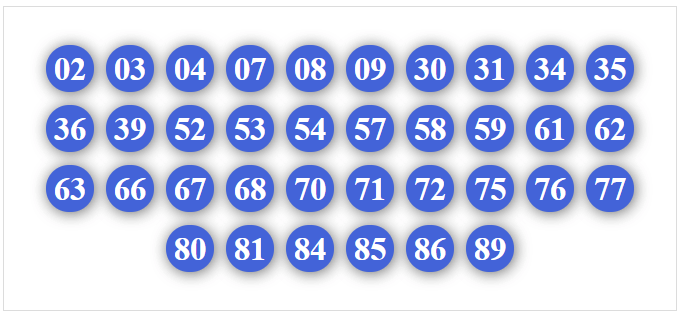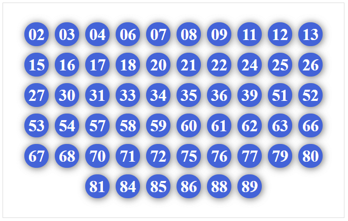 01, 02, 03, 04, 05, 06, 07, 08, 09, 40, 41, 42, 43, 45, 46, 47, 48, 49, 50, 51, 52, 53, 54, 56, 57, 58, 59, 80, 81, 82, 83, 84, 85, 86, 87, 89