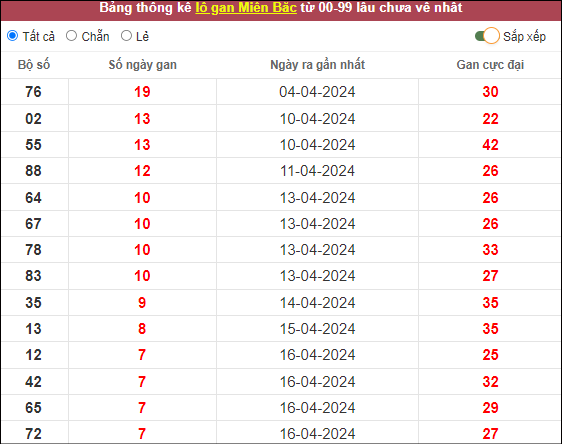 Thống kê lô tô miền Bắc hôm nay 24/4/2024