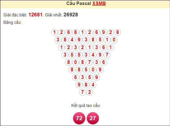 Kết quả từ soi cầu Pascale là cặp số may mắn: 27 72