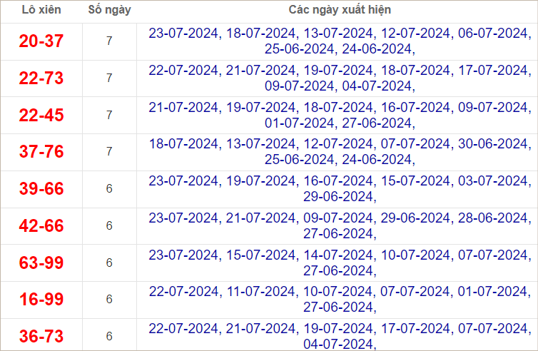 Cặp lô 06, 35, 40, 56, 73, 75, 84, 86 có độ dài 3 ngày.