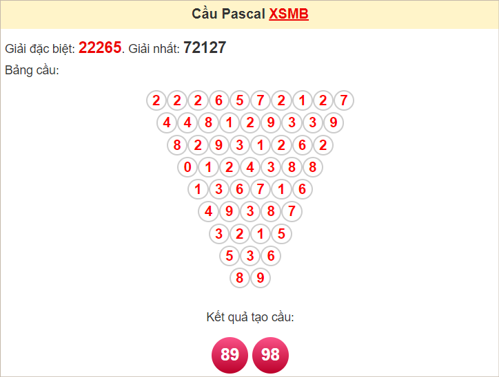 Kết quả từ soi cầu Pascale là cặp số may mắn: 89 98