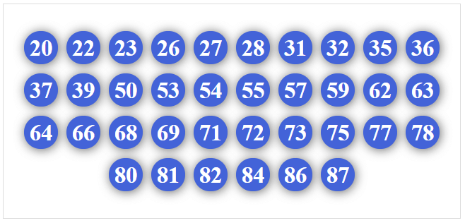 01, 02, 03, 04, 05, 06, 07, 08, 09, 10, 12, 13, 14, 15, 16, 17, 18, 19, 60, 61, 62, 63, 64, 65, 67, 68, 69, 90, 91, 92, 93, 94, 95, 96, 97, 98