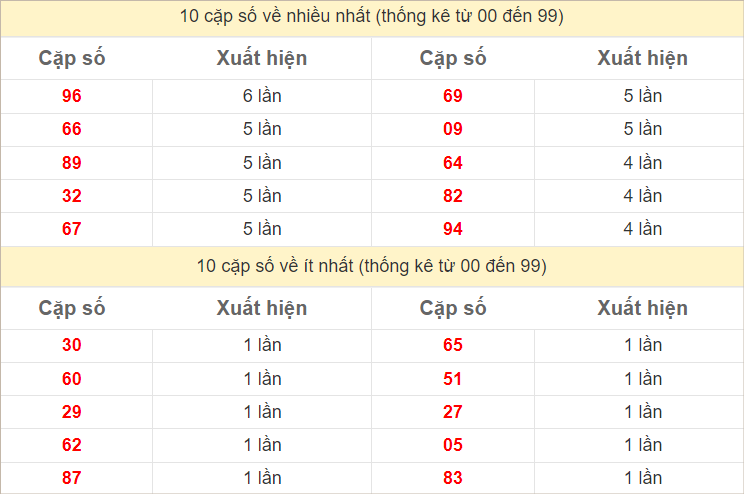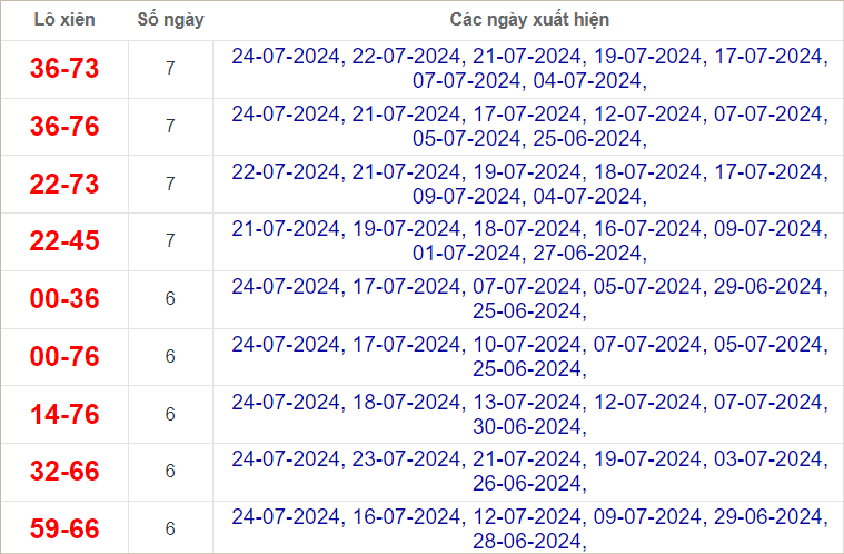 ⭐️ Thống kê tần suất các cặp lô về nhiều trong 10 ngày gần đây: 21, 73 (7 lần), 22, 36, 52, 66, 76, 89 (6 lần)