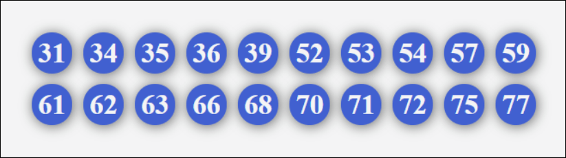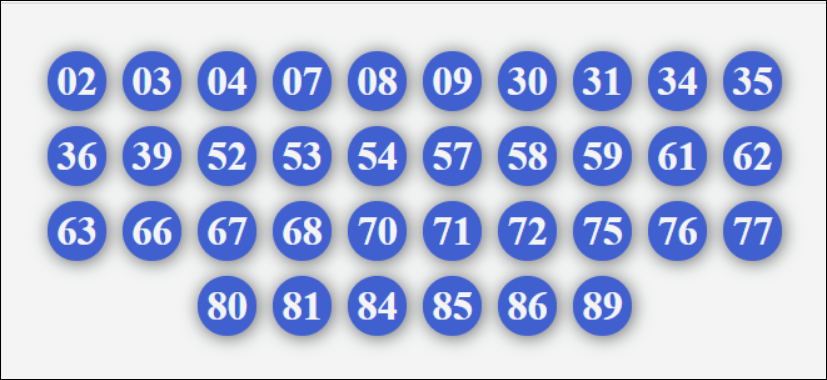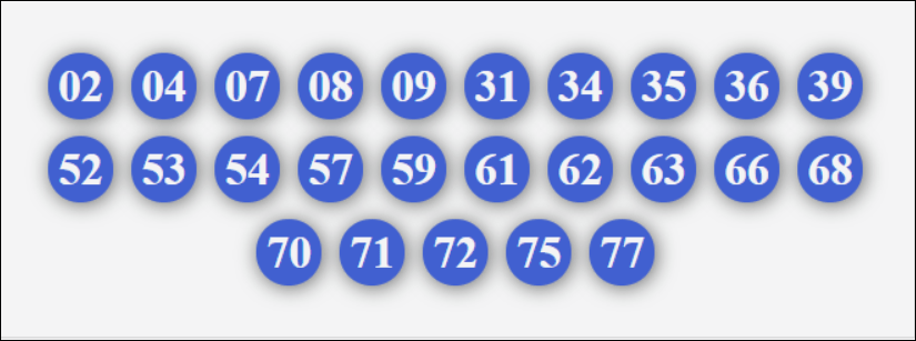 10, 12, 13, 14, 15, 16, 17, 18, 19, 20, 21, 23, 24, 25, 26, 27, 28, 29, 60, 61, 62, 63, 64, 65, 67, 68, 69, 70, 71, 72, 73, 74, 75, 76, 78, 79