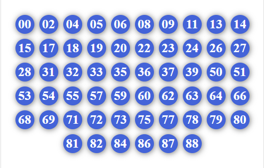 00, 01, 02, 03, 04, 05, 06, 07, 08, 09, 50, 51, 52, 53, 54, 56, 57, 58, 59