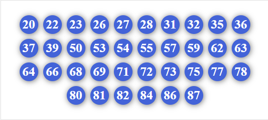 20, 21, 23, 24, 25, 26, 27, 28, 29, 30, 31, 32, 34, 35, 36, 37, 38, 39, 70, 71, 72, 73, 74, 75, 76, 78, 79, 80, 81, 82, 83, 84, 85, 86, 87, 89