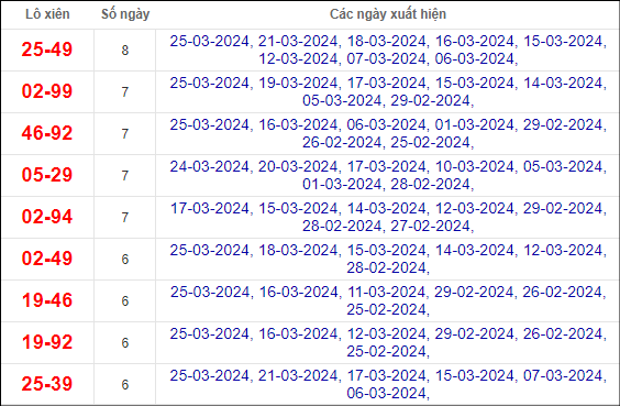 THỐNG KÊ LÔ TÔ KẾT QUẢ XSMB NGÀY 25-3-2024