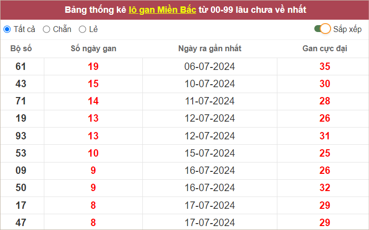 ⭐️Thống kê lô gan miền Bắc lâu ra nhất: 61 – 43 – 71 – 19 – 93