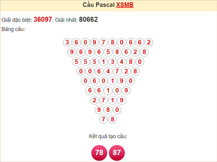 Kết quả từ soi cầu Pascale là cặp số may mắn: 78 87