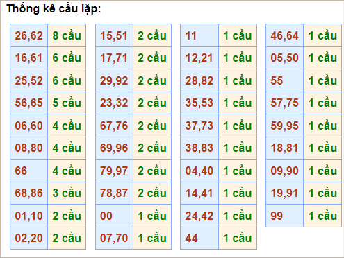 ⭐️ Thống kê tần suất các cặp lô về nhiều trong 10 ngày gần đây: 21, 22, 73 (8 lần), 36, 52, 66, 76, 89 (6 lần)