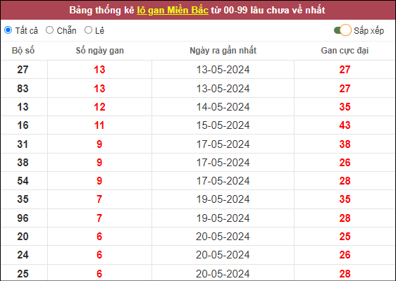Thống kê lô tô miền Bắc hôm nay 27/5