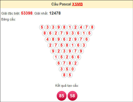 Kết quả từ soi cầu Pascale là cặp số may mắn: 85 58