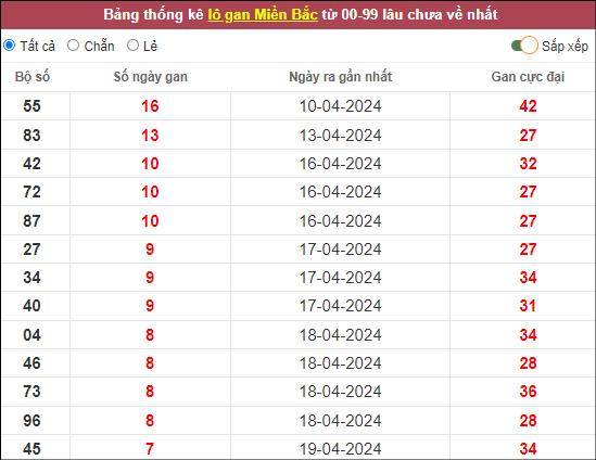 ⭐️Thống kê lô gan miền Bắc lâu ra nhất: 55 – 83 – 42 – 72 – 87