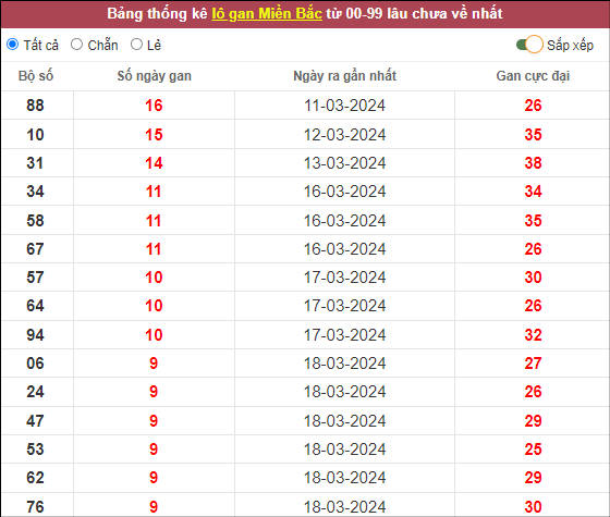 ⭐️Lô gan MB lâu ra nhất: 88 – 10 – 31 – 34 – 58