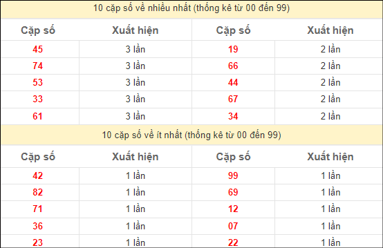 ⭐️ Thống kê tần suất các cặp lô về nhiều trong 10 ngày gần đây: 79 (7 lần), 23, 42, 71 (6 lần), 02, 13, 21, 25 (5 lần)