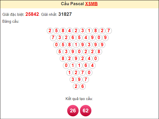 Kết quả từ soi cầu Pascale là cặp số may mắn: 26 62