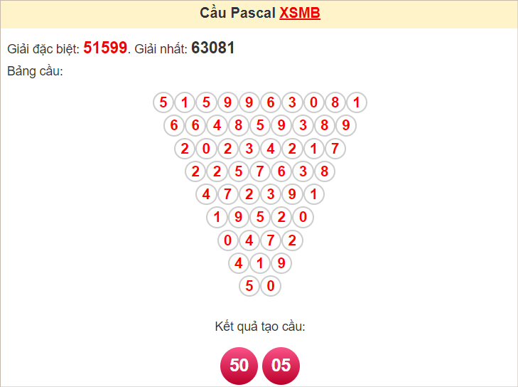 Kết quả từ soi cầu Pascale là cặp số may mắn: 50 05