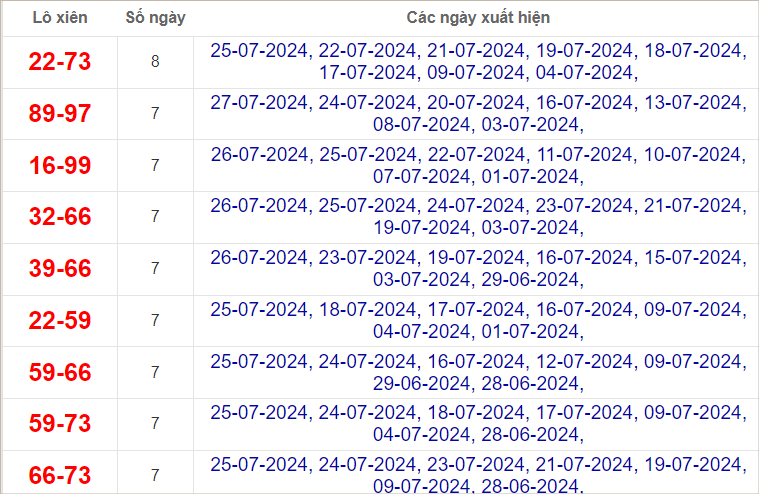 ⭐️ Thống kê tần suất lô về nhiều trong 30 ngày qua: 59, 66, 89 (16 lần), 22, 73, 76 (14 lần), 16, 21 (13 lần)