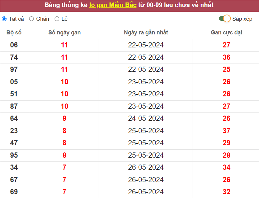⭐️ Lô gan miền Bắc lâu ra nhất: 06 – 74 – 97 – 05 – 51