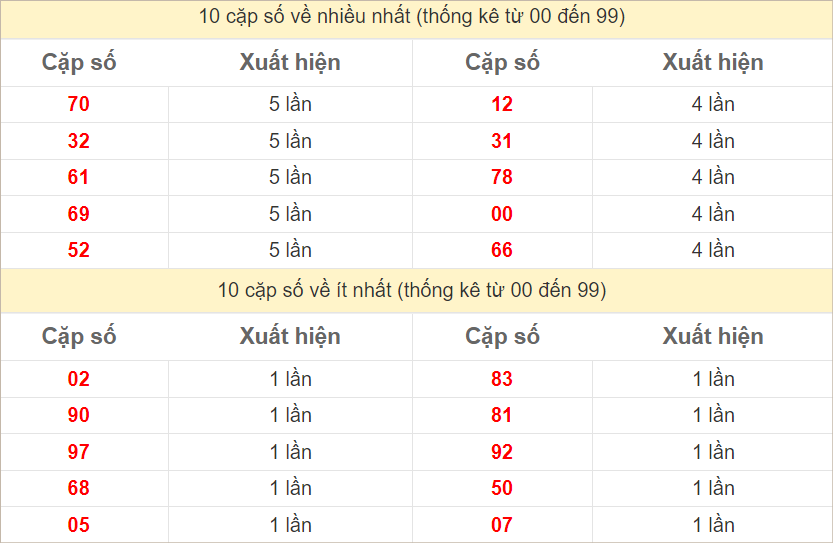 ⭐️ Thống kê tần suất các cặp lô về nhiều trong 10 ngày gần đây: 12 (10 lần), 70, 80, 92 (7 lần), 32, 52, 75 (6 lần), 08 (5 lần)