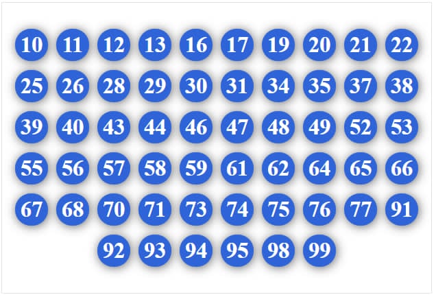 10, 12, 13, 14, 15, 16, 17, 18, 19, 30, 31, 32, 34, 35, 36, 37, 38, 39, 40, 41, 42, 43, 45, 46, 47, 48, 49, 90, 91, 92, 93, 94, 95, 96, 97, 98