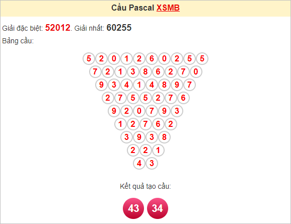 Kết quả từ soi cầu Pascale là cặp số may mắn: 43 34