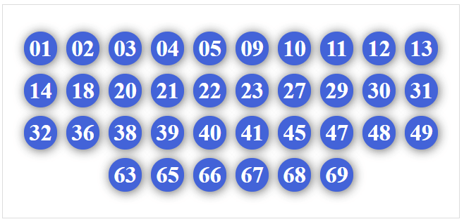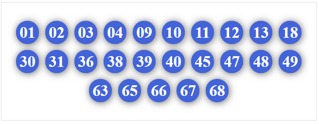 01, 02, 03, 04, 05, 06, 07, 08, 09, 10, 12, 13, 14, 15, 16, 17, 18, 19, 20, 21, 23, 24, 25, 26, 27, 28, 29, 60, 61, 62, 63, 64, 65, 67, 68, 69