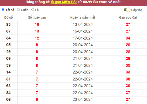 ⭐️Thống kê lô gan miền Bắc lâu ra nhất: 83 – 87 – 34 – 05 – 29