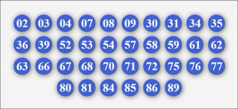 01, 02, 03, 04, 05, 06, 07, 08, 09, 20, 21, 23, 24, 25, 26, 27, 28, 29, 40, 41, 42, 43, 45, 46, 47, 48, 49, 90, 91, 92, 93, 94, 95, 96, 97, 98