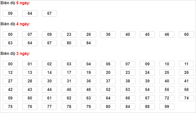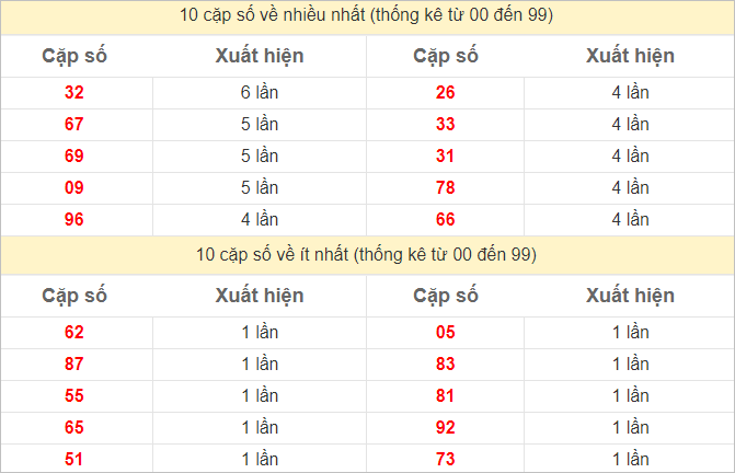 Cặp lô 11, 13, 17, 20, 26, 27, 30, 31, 33, 36, 37, 41, 47, 51, 53, 57, 60, 67, 72, 78, 82, 85, 88 có độ dài 4 ngày.