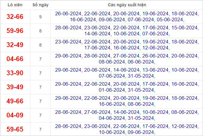 ⭐️ Thống kê tần suất các cặp lô về nhiều trong 10 ngày gần đây: 04, 23, 32, 59, 66 (6 lần), 25, 42, 45 (5 lần)