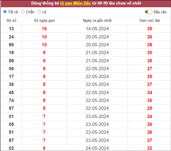 ⭐️Thống kê lô gan miền Bắc lâu ra nhất: 13 – 24 – 86 – 18 – 58
