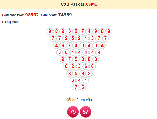 Kết quả từ soi cầu Pascale là cặp số may mắn: 57 75