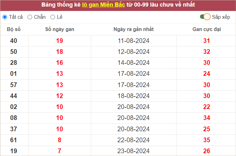 ⭐️Thống kê lô gan miền Bắc lâu ra nhất: 40 – 50 – 28 – 01 – 57