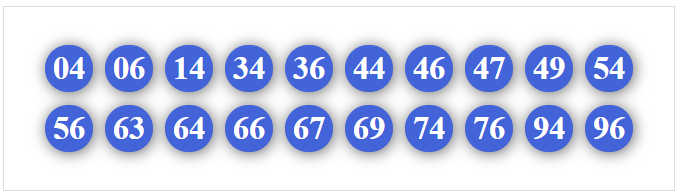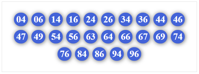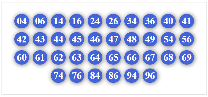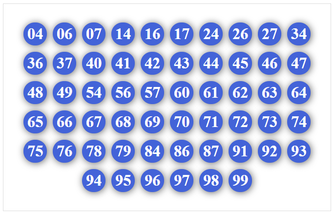 01, 02, 03, 04, 05, 06, 07, 08, 09, 10, 12, 13, 14, 15, 16, 17, 18, 19, 40, 41, 42, 43, 45, 46, 47, 48, 49, 60, 61, 62, 63, 64, 65, 67, 68, 69