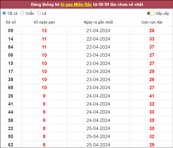 ⭐️ Lô gan MB lâu ra nhất: 09 – 14 – 84 – 06 – 15