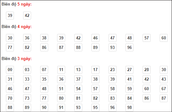 Cặp lô 00, 01, 02, 05, 07, 08, 09, 15, 18, 21, 25, 27, 28, 42, 51, 52, 54, 59, 60, 61, 65, 66, 68, 81, 82, 83, 84, 89, 93, có độ dài 2 ngày.