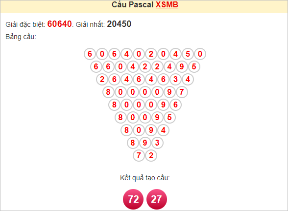 Kết quả từ soi cầu Pascale là cặp số may mắn: 72 27