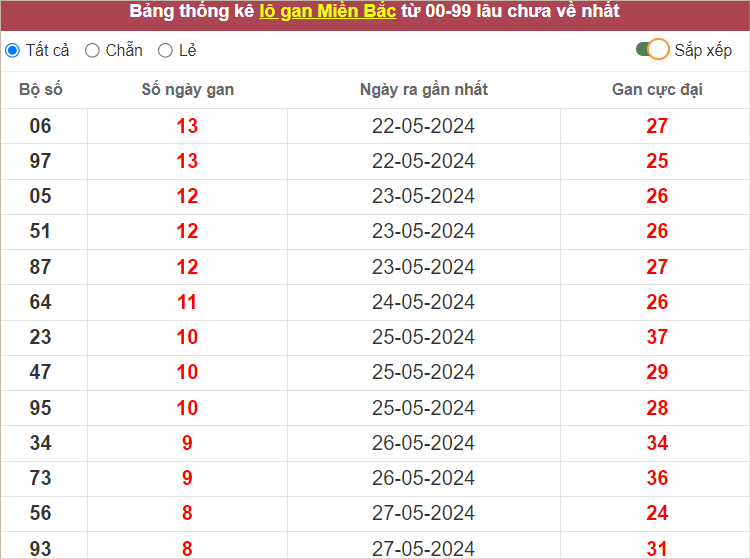⭐️ Lô gan miền Bắc lâu ra nhất: 06 – 97 – 05 – 51 – 87