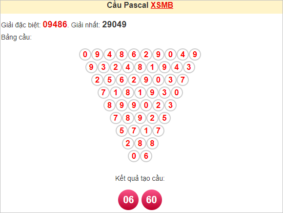 Kết quả từ soi cầu Pascale là cặp số may mắn: 06 60
