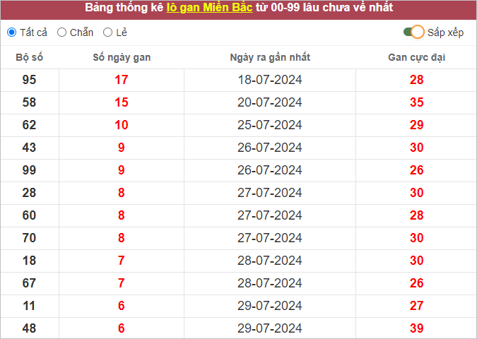⭐️Lô gan MB lâu ra nhất: 95 – 58 – 62 – 43 – 99