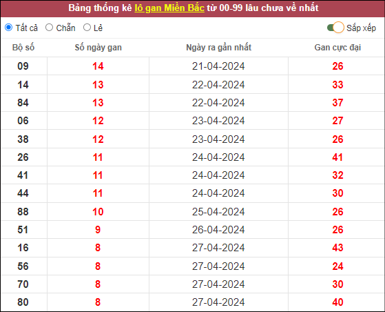 ⭐️ Lô gan miền Bắc lâu ra nhất: 09 – 14 – 84 – 06 – 38