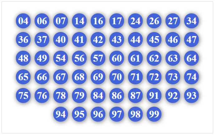 01, 02, 03, 04, 05, 06, 07, 08, 09, 10, 12, 13, 14, 15, 16, 17, 18, 19, 20, 21, 23, 24, 25, 26, 27, 28, 29, 70, 71, 72, 73, 74, 75, 76, 78, 79
