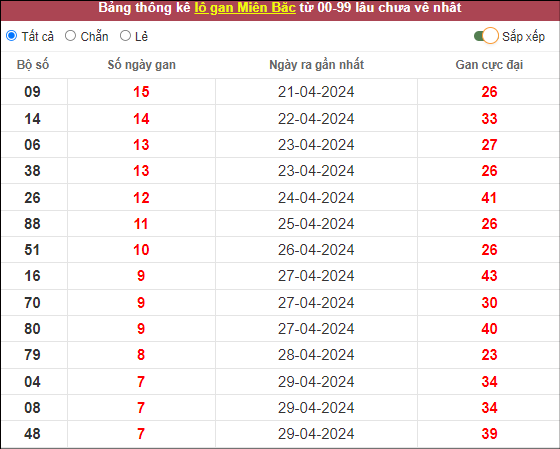 ⭐️Thống kê lô gan MB lâu ra nhất: 09 – 14 – 06 – 38 – 26