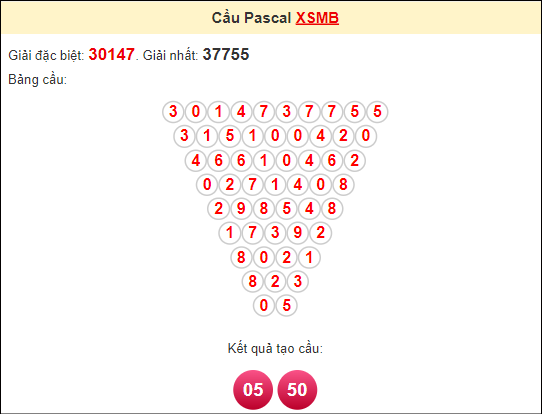 Kết quả từ soi cầu Pascale là cặp số may mắn: 05 50